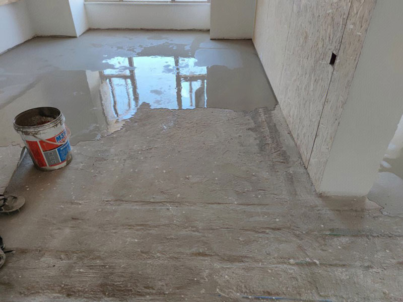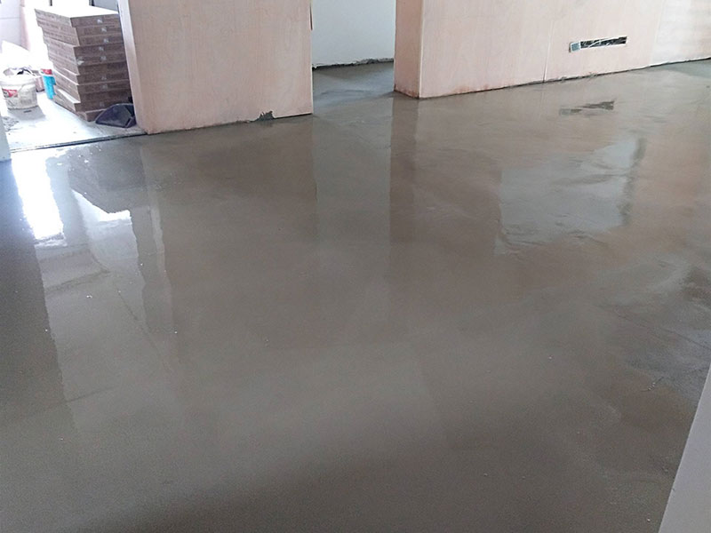 第三步是倒自流平水泥,確保水泥能夠流動,不可以加水過多,否則干燥后強度不夠,容易起灰,起塵,在界面劑成膜以后,就可以將攪拌好的自流平水泥均勻倒在地上,倒到地面上之后,水泥順勢流平,但是不能完全流平,需要施工人員用自流平刮尺刮平。